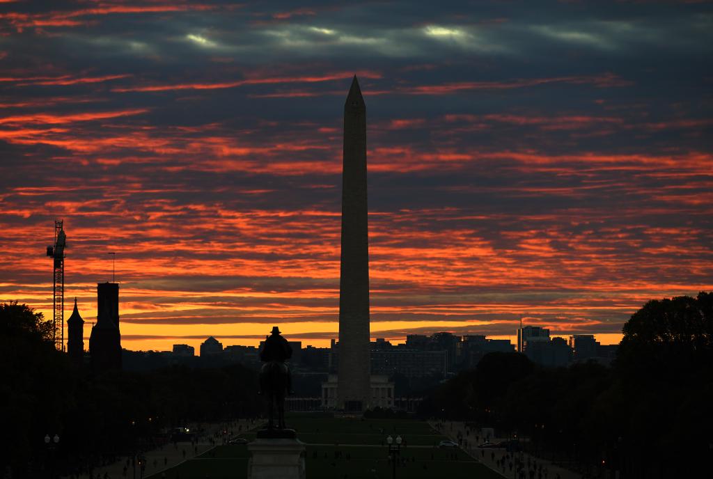 这是2025年10月15日拍摄的日落时分的美国华盛顿纪念碑。新华社记者李睿摄