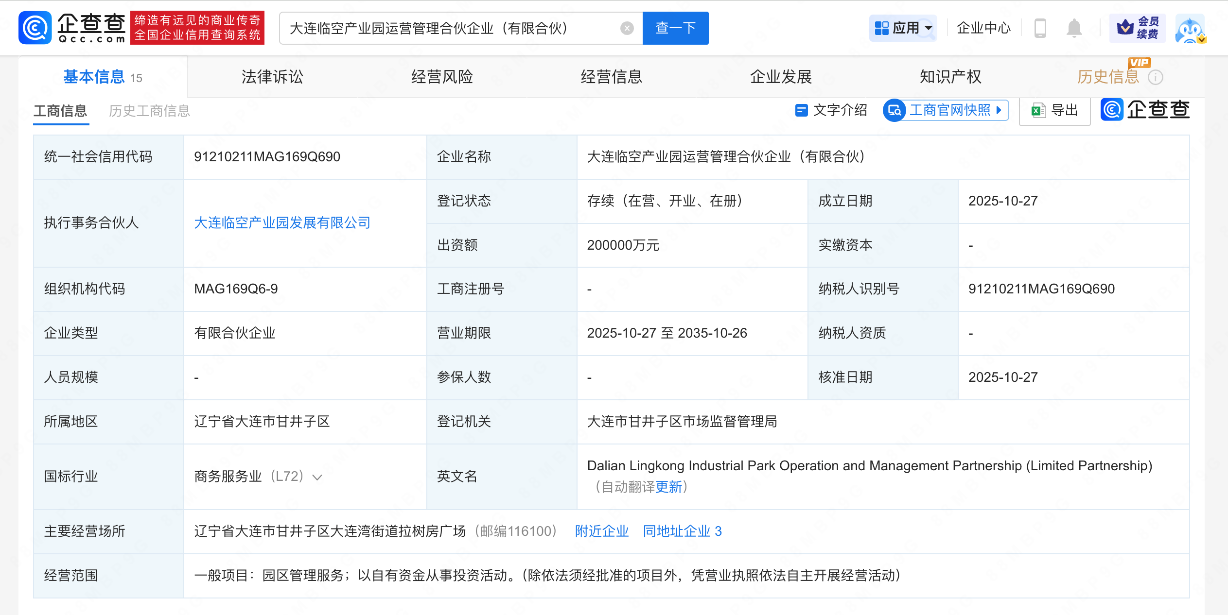 近日第一资本,大连临空产业园运营管理合伙企业(有限合伙)成立,执行事务合伙人为大连临空产业园发展有限公司,出资额20亿人民币,经营范围含园区管理服务、以自有资金从事投资活动。企查查股权穿透显示,该合伙企业由大连临空产业开发建设有限公司、大连新鸿置业有限公司、大连凌川置业有限公司等共同出资。